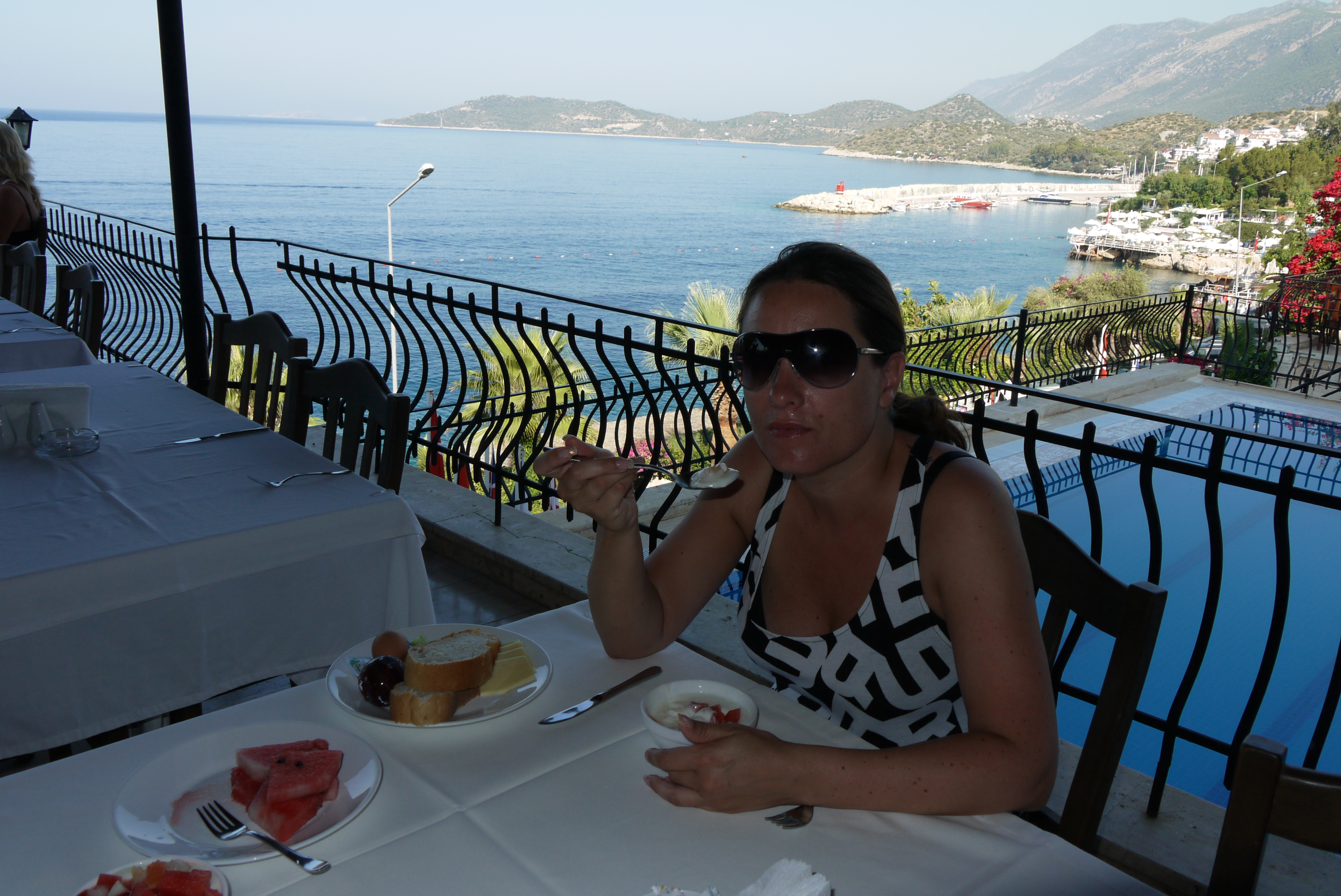 Vi har bokat halvpension vilket visar sig vara ett excellent val. Maten på hotellet är utmärkt, frukostbuffén är väl tilltagen med allehanda frukter och yoghurtar och middagsbuffén gör oss heller inte besvikna. Här äter vi gott hela veckan. Även luncherna som vi äter nästan varje dag nere vid terrassen vid vattnet är makalöst goda, speciellt halloumisalladen. Kas ligger i en bukt med höga berg i bakgrunden, det får effekten av en överhettad gryta och flera gånger närmar jag mig solsting. Det gäller att inte röra sig alltför mycket, redan kl 6 på morgonen är det nästan för hett för att ta en promenad.