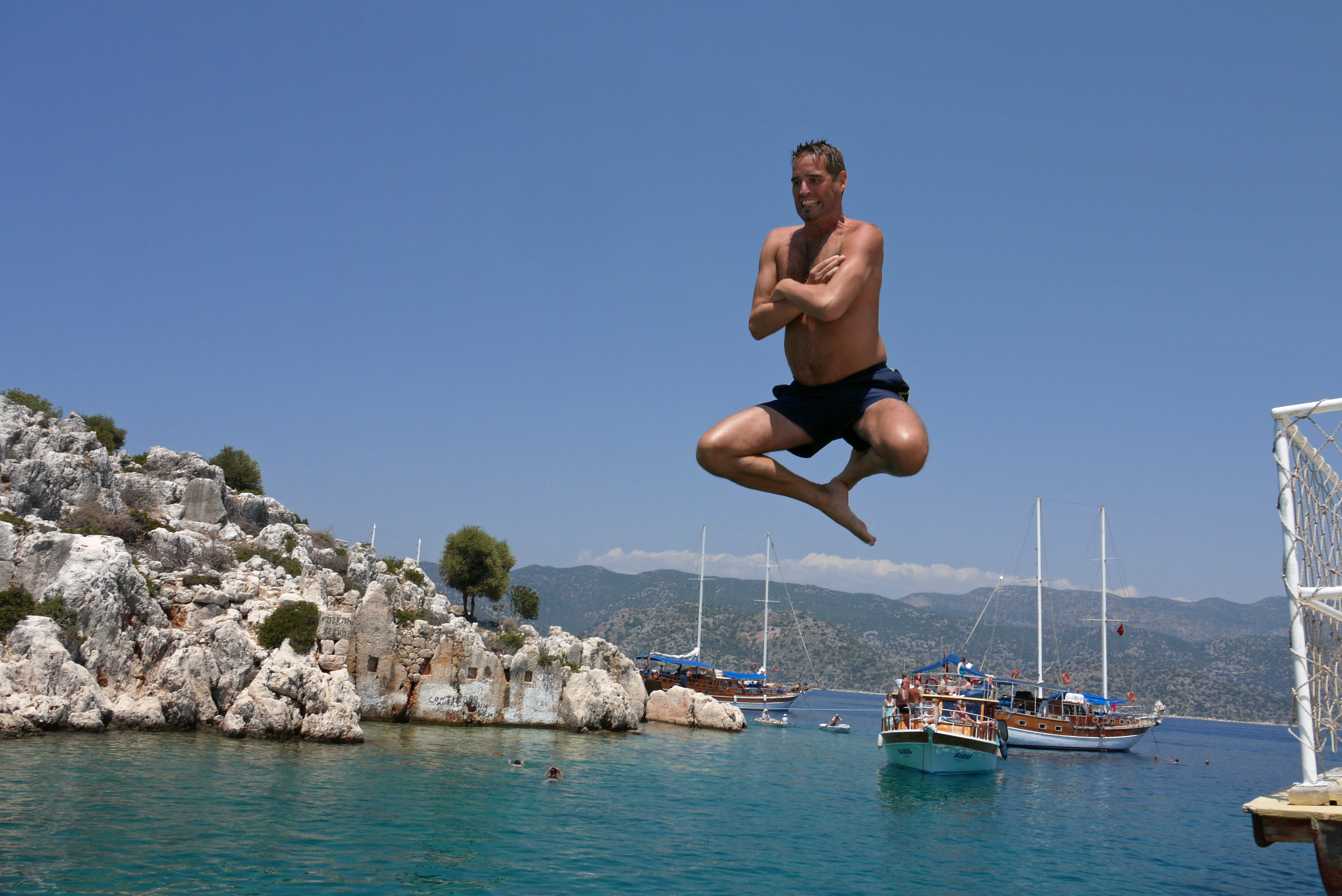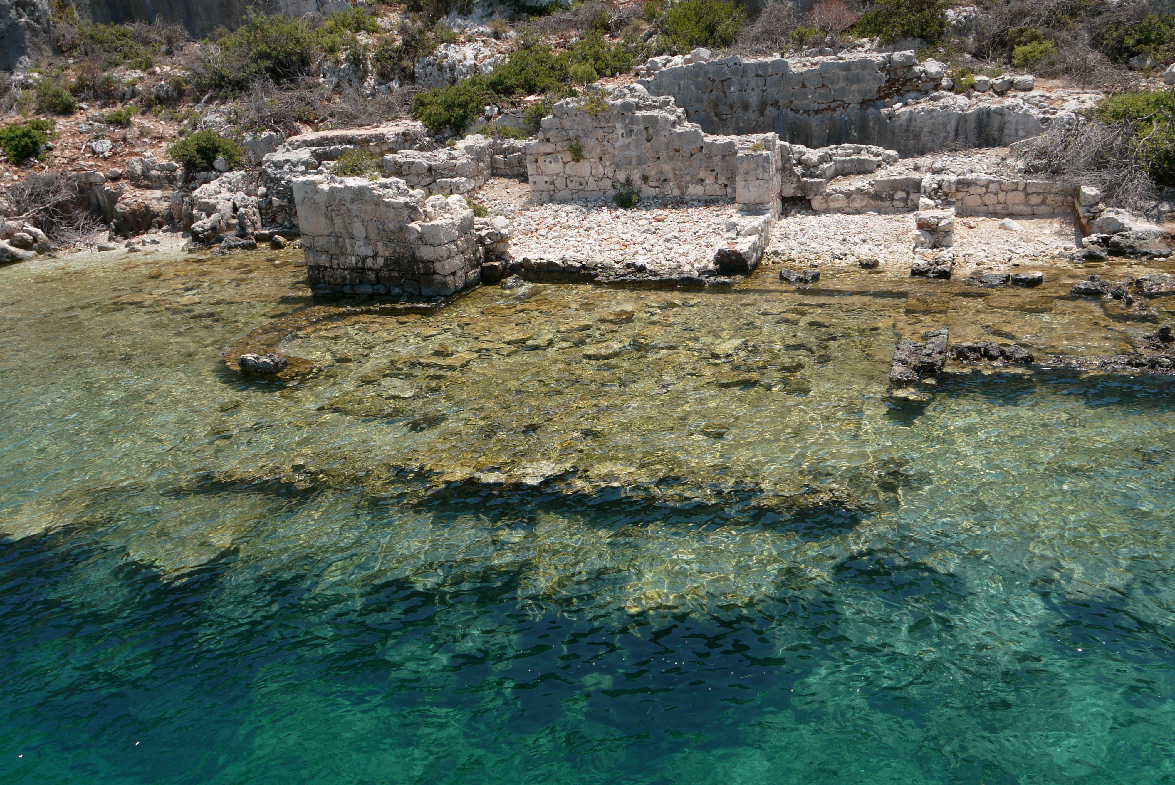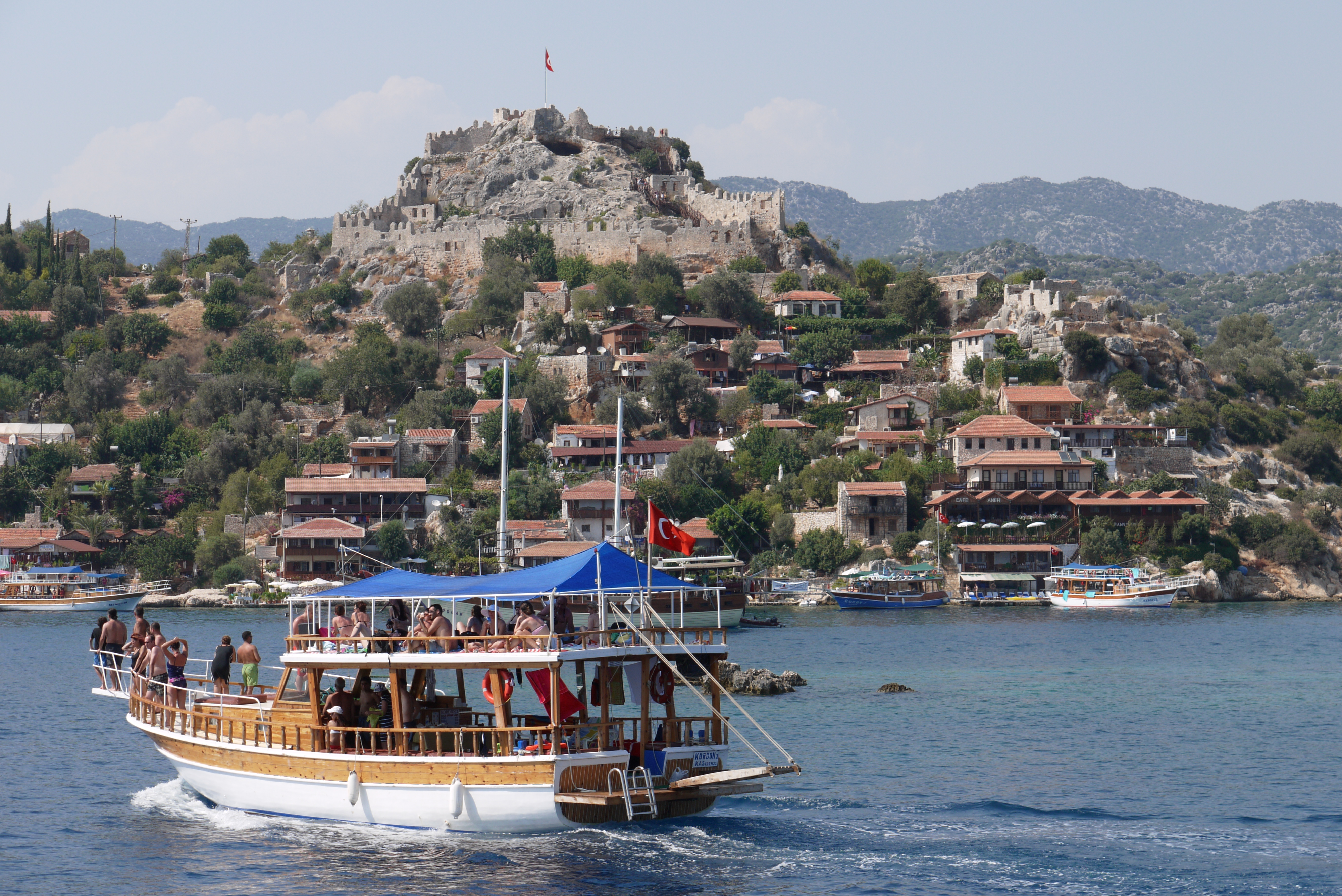 Vi tar en snorkeltur till Kekova island och den sjunkna staden Dolchiste som förstördes av en jordbävning på 100-talet. Pga de antika ruinerna får man inte dyka eller snorkla just här, men vi gjorde många andra badstopp på vägen. Det var underbart att få hoppa i vattnet, det var kokande hett på båten. Pda tog bokstavligen fasta på ordet hoppa, jag äntrade dock vattnet från stegen och inte från relingen.