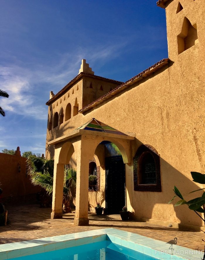 Efter nio timmar, kl. 17, kommer vi så fram till Agdz där vi sover en natt på ett halvdant hotell, Maison d’hote Rose du Sable. Läs vår recension här. Hotellet ligger en bra bit utanför själva staden och eftersom vi är så trötta att vi inte orkar utforska området är det tur att middag ingår. Det är bara vi och ett par med en liten son som bor på hotellet denna natt.