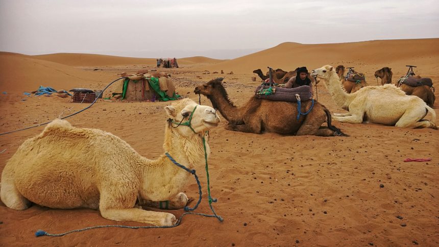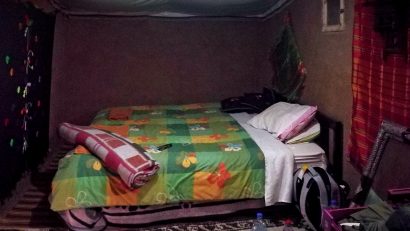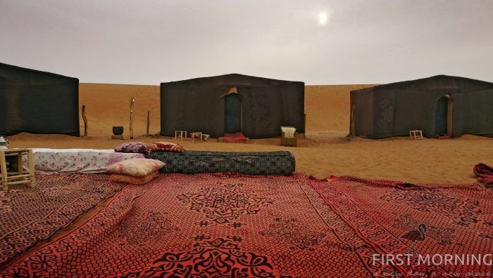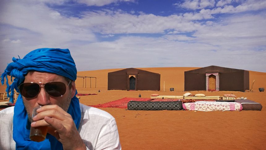 Vi kommer fram till tältcampen kl. 16. ”Tälten” är gjorda av lera och tyg och inhyser en dubbelsäng. Klockan 17.30 ger sig Pda ut på en kameltur, jag är tyvärr för sjuk för att följa med. Kamelturen ska ta 40 minuter. Jag ligger på en madrass och läser under tiden. Tänker att: ”här ligger jag i Saharaöknen på en madrass och läser. Är det inte helt fantastiskt att få vara med om en sådan sak?” Jag blir nästan religiös. Kastas sedan tillbaka till mitt mer sansade och pragmatiska jag när jag inser att Pda nu varit borta i över två och en halv timme.