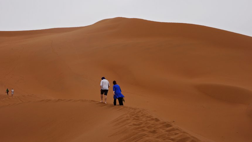 Vi börjar klättringen upp mot toppen via kammen på en svagt lutande sanddyn. Mot slutet är det så brant att vi får krypa på alla fyra. Det är varmt, törstigt och jobbigt, men väl värt mödan upptäcker vi när vi kommer upp.