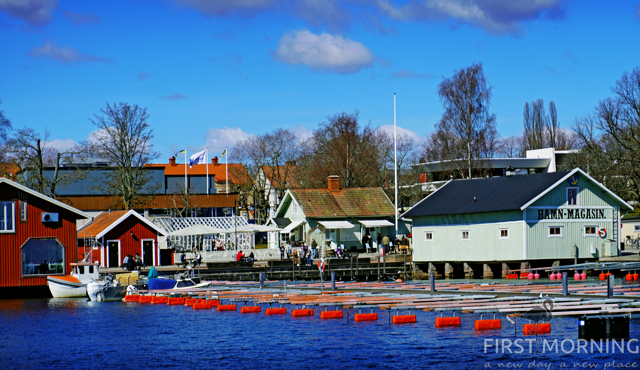 Vi tar en kaffe vid ån på Gula Paviljongen på Hamngatan 7. Alla turister har letat sig till hamnen och köar till Moster Elins glass som har de mest fantastiska glasskreationer. Här kan man verkligen snacka om glass i stora lass.