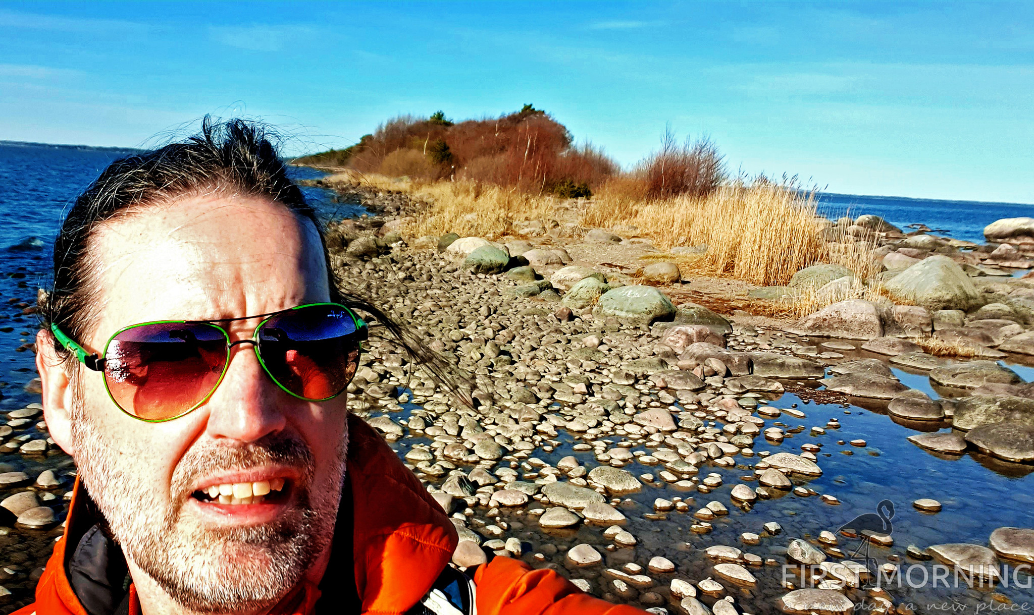 När vi åker från Läckö slott passar vi på att svänga av till Hindens rev. Vi sicksackar oss fram på småvägar och tar hjälp av gps:en att hitta fram. Hindens rev sticker ut som en smal spets en halv mil rakt ut i Vänern. Från parkeringen är det 4 km vandring på välupptrampad stig. Räkna med 40-50 minuters vandring enkel väg. När det är ett par hundra meter kvar dyker sjömärket Båken upp, ett svart-vitt fem meter högt sjömärke. Här finns en bänk och en liten grillplats. Efter det känns det som man balanserar mitt ute i tomma intet, vatten åt alla håll! Fantastisk känsla.