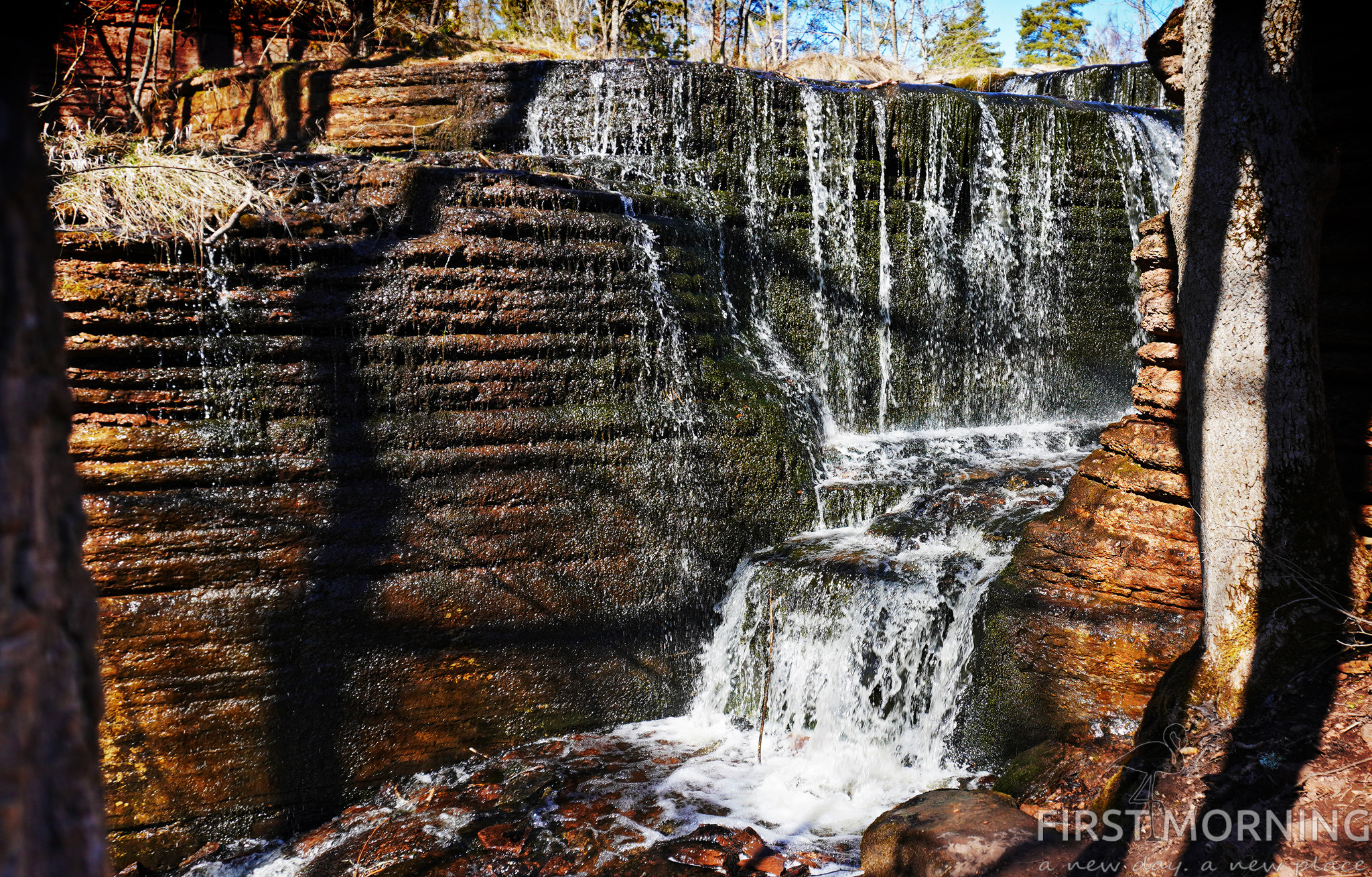När man nästan är framme finns det skyltar att följa. Man kan gå ner, upp och runt hela fallet.