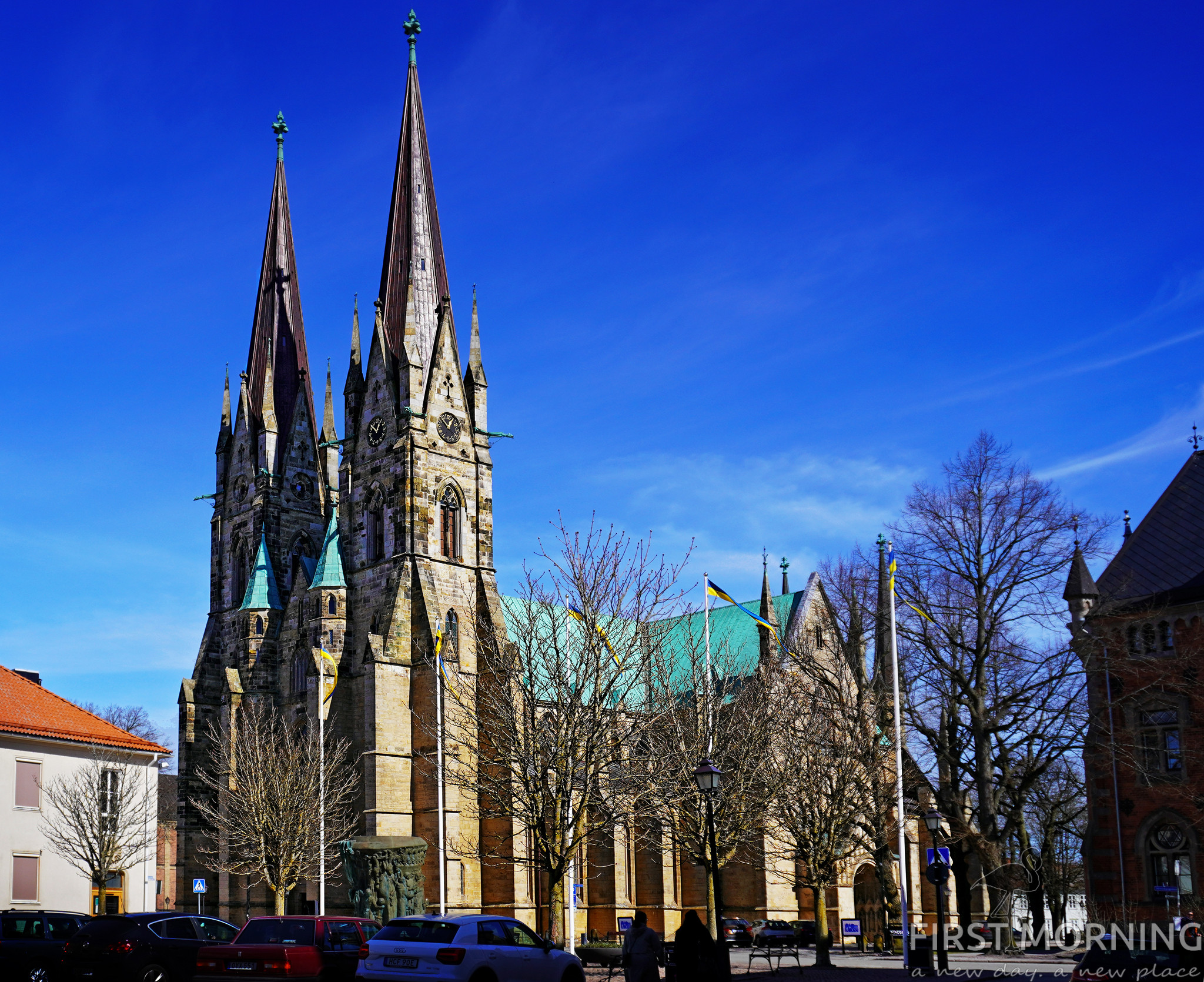 När vi ändå är i krokarna så svänger vi in i Skara för att besöka domkyrkan och äta lunch. Vid det lilla torget intill kyrkan hittar vi en öppen pizzeria. Det är väl i stort sett bara några få pizzerior som är öppna denna påskafton mitt på dagen.